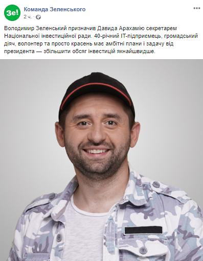 Президент Владимир Зеленский назначил блогера, IT-предпринимателя и являющегося четвертым номером партии "Слуга народа" Давида Арахамию секретарем Национального инвестиционного совета. Об этом говорится в указе № 423/2019,  опубликованном на сайте главы государства. Также о назначении сообщается на странице Команды зеленского в соцсети.