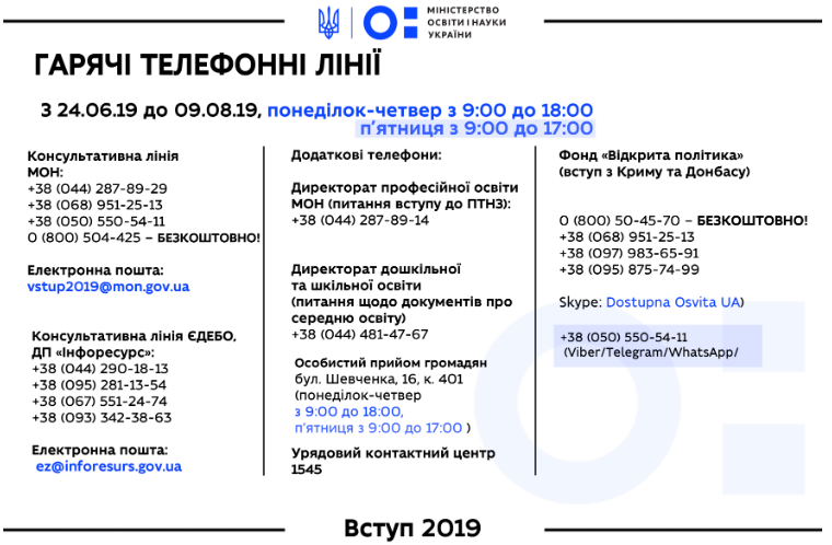 С 24 июня по 9 августа будут работать горячие линии МОЗ, где можно будет уточнить информацию по вступительной кампании в этом году.