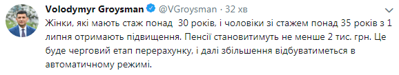 Проработавшие 30-35 лет украинцы получат пенсии от 2 тысяч гривен - Гройсман