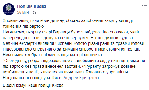Суд в Киеве арестовал подозреваемого в убийстве 9-летнего мальчика без права залога. Об этом сообщает пресс-служба Нацполиции столицы в Facebook.