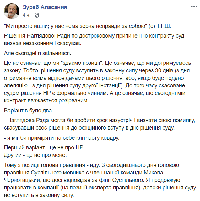 19 июня Шевченковский райсуд столицы отменил решение наблюдательного совета НОТУ относительно увольнения Зураба Аласании с должности главы общественного вещателя