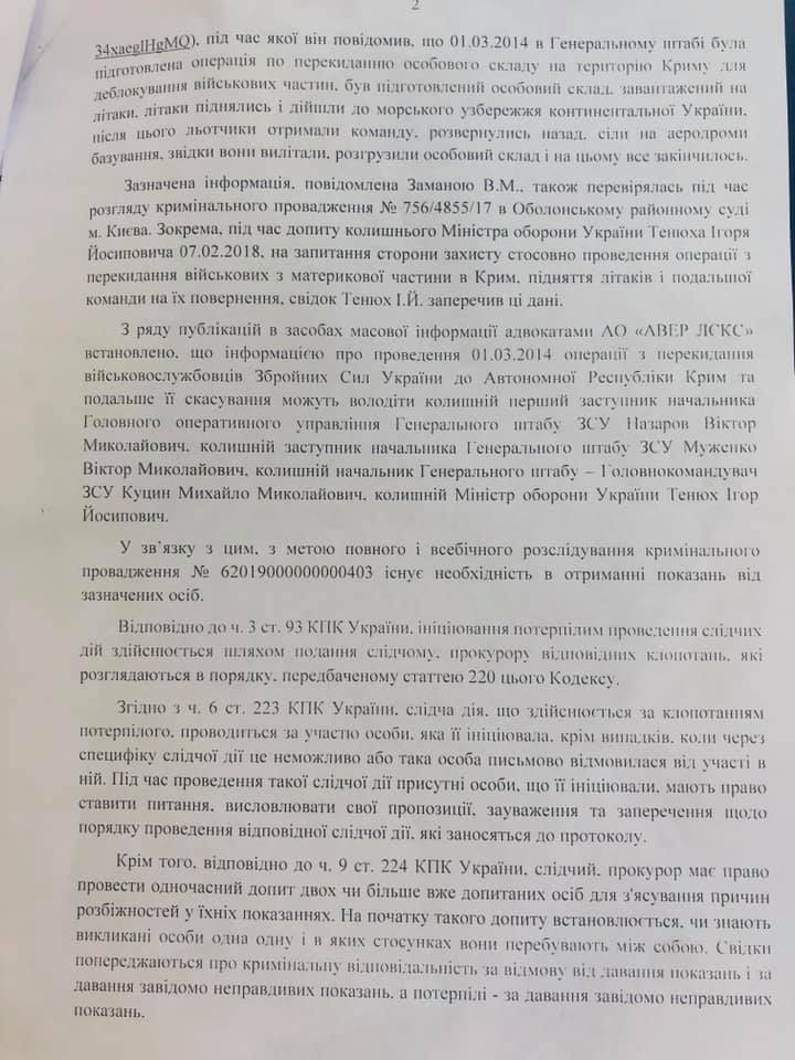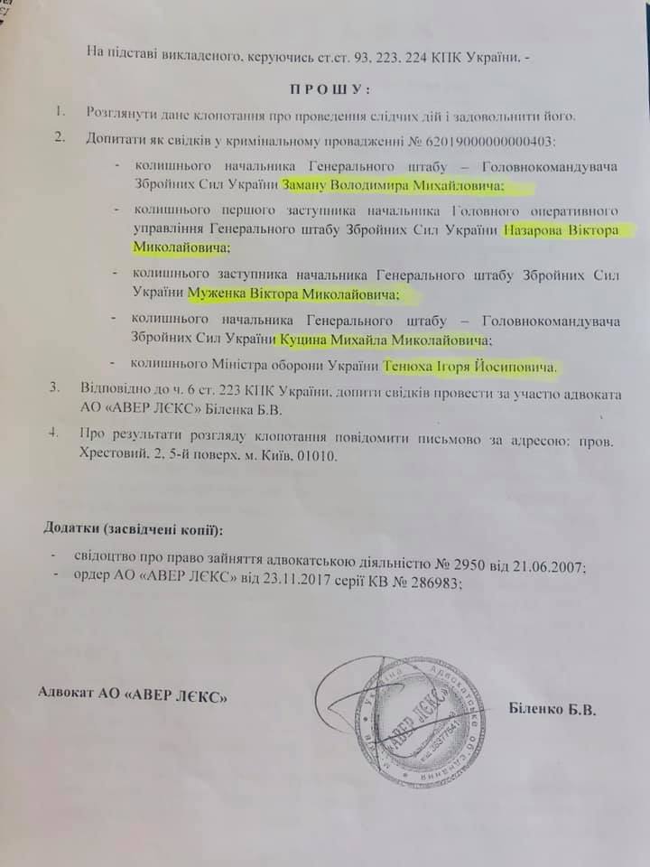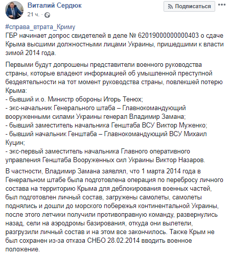 По его словам, первыми будут допрошены "представители военного руководства страны, которые владеют информацией об умышленной преступной бездеятельности на тот момент руководства страны, повлекшей потерю Крыма": бывший и.о. министр обороны Игорь Тенюх; экс-начальник Генерального штаба - Главнокомандующий вооруженными силами Украины генерал Владимир Замана; бывший заместитель начальника Генштаба ВСУ Виктор Муженко; бывший начальник Генштаба - Главнокомандующий ВСУ Михаил Куцин; экс-первый заместитель начальника Главного оперативного управления Генштаба Вооруженных сил Украины Виктор Назаров.