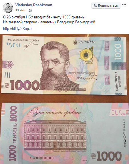 Национальный банк Украины анонсировал введение новой банкноты номиналом в 1 тысячу гривен. Об этом сообщил заместитель исполнительного директора МВФ Владислав Рашкован на своей странице в Facebook.