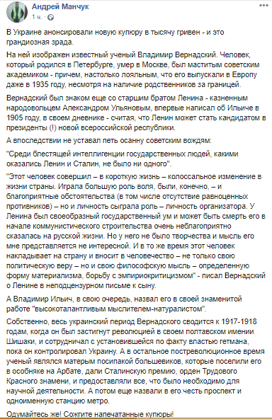 "Собственно, весь украинский период Вернадского сводится к 1917-1918 годам, когда он был застигнут революцией в своем полтавском имении Шишаки, и сотрудничал с установившейся по факту властью гетмана, пока он контролировал Украину. А в остальное постреволюционное время ученый являлся матерым посипакой большевиков, которые поселили его в особняке на Арбате, дали Сталинскую премию, орден Трудового Красного знамени, и предоставляли все, что было необходимо для научной деятельности", - написал он в Facebook.