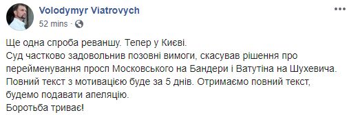 "Суд частично удовлетворил исковые требования, отменил решение о переименовании ул.Московской на Бандеры и Ватутина на Шухевича", – написал он на своей странице в Facebook.