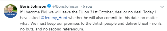 "Если я стану премьер-министром, мы покинем ЕС 31 октября, со сделкой или без неё. Сегодня я спросил Джереми Ханта (глава МИД Великобритании - прим.ред) готов ли он к этой дате, несмотря ни на что. Мы должны сдержать наши обещания британскому народу и реализовать "Брекзит" - никаких "если", никаких "но" и никакого второго референдума", - написал Джонсон.