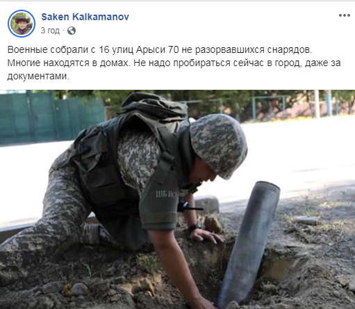 "Военные собрали с 16 улиц Арыси 70 неразорвавшихся снарядов. Многие находятся в домах. Не надо пробираться сейчас в город даже за документами", - написал Сакен Калкаманов и выложил фото работы саперов.