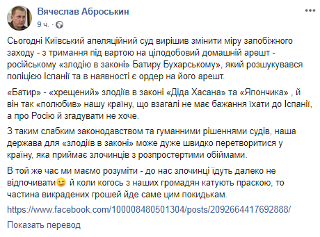 Во вторник, 25 июня, Киевский апелляционный суд изменил меру пресечения российскому "вору в законе" Батыру Бухарскому, которого весной задержали под Киевом. Об этом написал начальник криминальной полиции Вячеслав Аброськин на своей странице в Facebook.