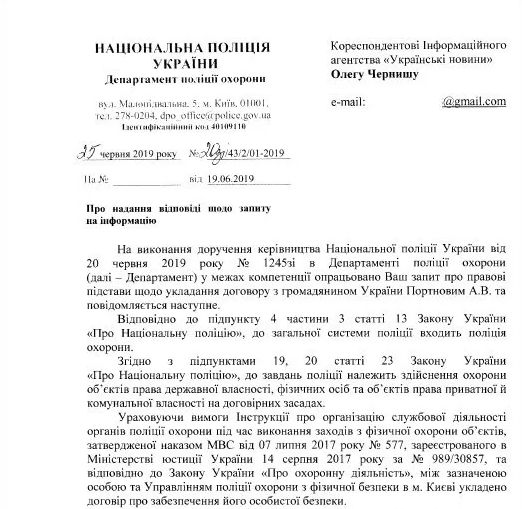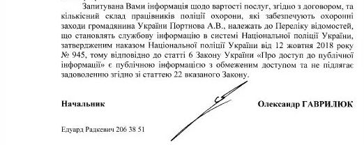 "Запрашиваемая Вами информация относительно стоимости услуг, согласно договору, и количественном составе сотрудников полиции охраны, которые обеспечивают охранные мероприятия гражданина Украины Портнова А.В., включены в свод сведений, которые составляют служебную информацию в системе Национальной полиции Украины", - сказано в документе.