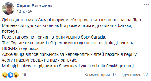 О смерти мальчика первым сообщил экс-мэр Ужгорода Сергей Ратушняк, которому принадлежит аквапарк. Ратушняк отметил, что родные потеряли бдительность и ребенок исчез из поля зрения взрослых. "Маленький замечательный мальчик, с которым отдыхали родные, утонул. Горе произошло по причине потери внимания со стороны родственников Будьте бдительными и осторожными в отношении несовершеннолетних детишек на любых водоемах", - пишет в сети Сергей Ратушняк.
