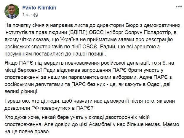 26 июня  Павел Климкин призвал Верховную Раду отозвать у ПАСЕ приглашение наблюдать за выборами в украинский парламент, если Парламентская ассамблея вернет в свои ряды россиян. Об этом министр иностранных дел Украины написал на своей странице в Facebook.