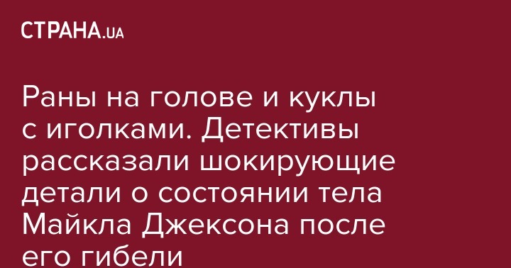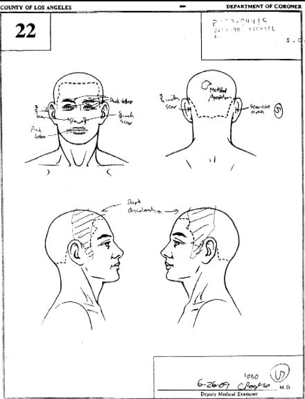 По словам следователей, которые осматривала тело Джексона после смерти, на голове певца были очень серьезные раны. "Это не человек, который должен был умереть. То, что было наиболее странным, когда я периодически смотрел на него - его голова. Потому что всегда, когда он был на публике, он носил парик. Глядя на его кожу, верхняя часть головы была в серьезных ранах", - рассказал один из полицейских.