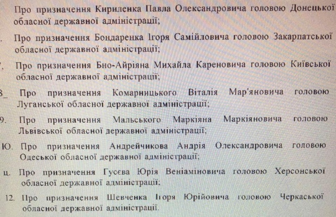 - Бно-Айрияна Михаила Кареновича на должность председателя Киевской ОГА;