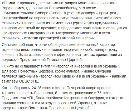 Он также добавил, что эти обращения имели не личный характер отдельных иностранных епископов, выражая их собственную точку зрения, а были использованы в официальных текстах приветствий за подписью предстоятелей поместных церквей. "Никто не оспаривает титул "Митрополит Киевский и всея Украины". Для всех поместных церквей, кроме Фанара, именно Онуфрий является законным митрополитом Киевским и всея Украины", - сообщил Данилевич.