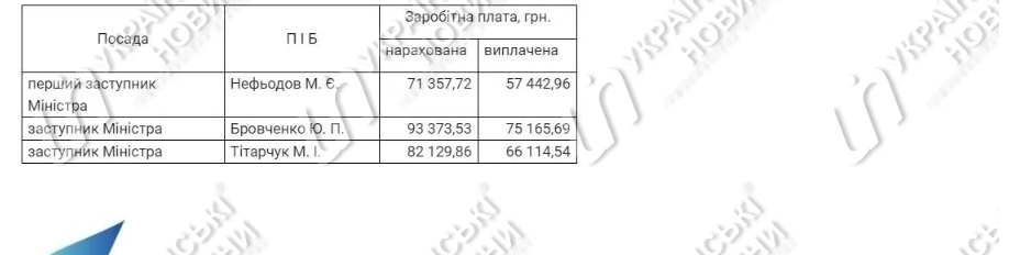 Зарплата первого заместителя министра экономического развития и торговли Максима Нефедова составила 71,4 тыс. гривен, заместителей Юрия Бровченко - 93,4 тыс. гривен, Михаила Титарчука - 82,1 тыс. гривен.