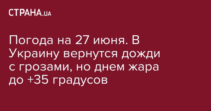 Сегодня, 27 июня, на части Украины пройдут дожди с грозами, но на значительной территории страны будет жарко, днем до +35 градусов. Об этом сообщает сайт Укргидрометцентра.