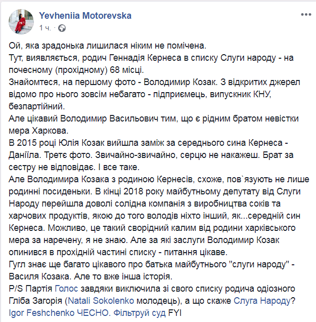 "В 2015 году Юлия Козак вышла замуж за среднего сына Кернеса - Даниила. Но Владимира Козака с семьей Кернес, похоже, связывают не только родственные посиделки. В конце 2018 будущем депутату от "Слуги народа" перешла довольно солидная компания по производству соков и пищевых продуктов, которой к тому владел... средний сын Кернеса. Возможно, это такой своеобразный калым от семьи харьковского мэра за невесту, я не знаю. Но за какие заслуги Владимир Козак оказался в проходной части списка - вопрос интересный", - пишет Моторевская.