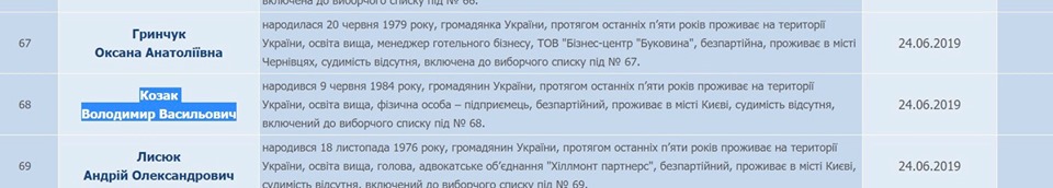 Под номером 68 в списке партии "Слуга народа" значится Владимир Козак. Как выяснила журналистка Евгения Моторевская, он приходится родственником мэру Харькова Геннадию Кернесу. Об этом Моторевская написала на своей странице в Facebook.