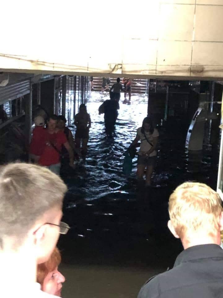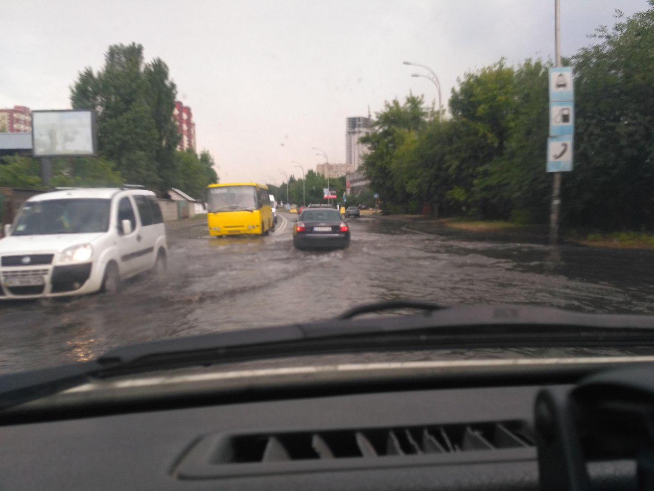В обед ливень затопил несколько улиц в Киеве. Автомобили вынуждены были выезжать на проспект Героев Сталинграда по самые номера в воде.