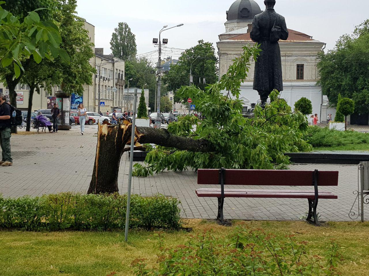 Ветер сломал дерево у памятника Григорию Сковороде на Контрактовой.