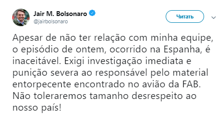 "Я потребовал немедленного и сурового наказания для лица, ответственного за наркотическое вещество, обнаруженное в военном самолете", - написал Болсонару в своем микроблоге в Twitter.