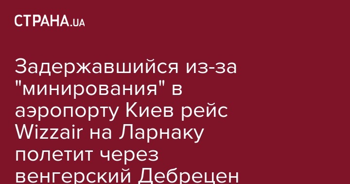 Рейс авиакомпании Wizzair W6 6259 по маршруту Киев (аэропорт "Киев" им. Сикорского) - Ларнака (Кипр), который задержался с вылетом из-за "минирования" аэропорта "Киев" днем в четверг, теперь будет осуществляться через Дебрецен (Венгрия), где будет сменен экипаж и борт, а затем продолжен полет на Ларнаку (Кипр). ОБ этом сообщает "Интерфакс-Украина".