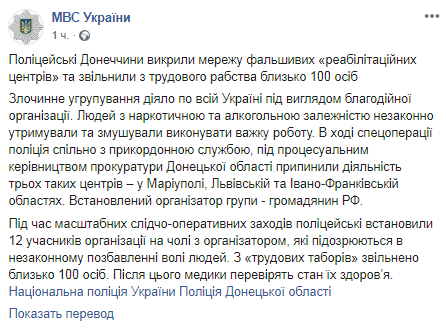 "Преступная группировка действовала по всей Украине под видом благотворительной организации. Людей с наркотической и алкогольной зависимостью незаконно удерживали и заставляли выполнять тяжелую работу. В ходе спецоперации полиция совместно с пограничной службой, под процессуальным руководством прокуратуры Донецкой области пресекли деятельность трех таких центров - в Мариуполе, Львовской и Ивано-Франковской областях. Установлен организатор группы - гражданин РФ", - сказано в сообщении.