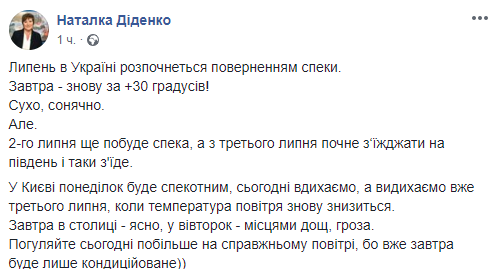 По ее словам, в понедельник, 1 июля, в Украине температура снова поднимется за +30 градусов и продержится до 2 июля, а со среды жара начнет смещаться на юг.
