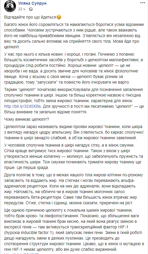 Одна из причин появления целлюлита - локальная ишемия жировой ткани, то есть недостаток крово- и лимфообращения, которое провоцирует в тканях недостаток кислорода. Об этом в понедельник сообщила исполняющая обязанности министра здравоохранения Украина Ульяна Супрун на своей странице в Facebook.