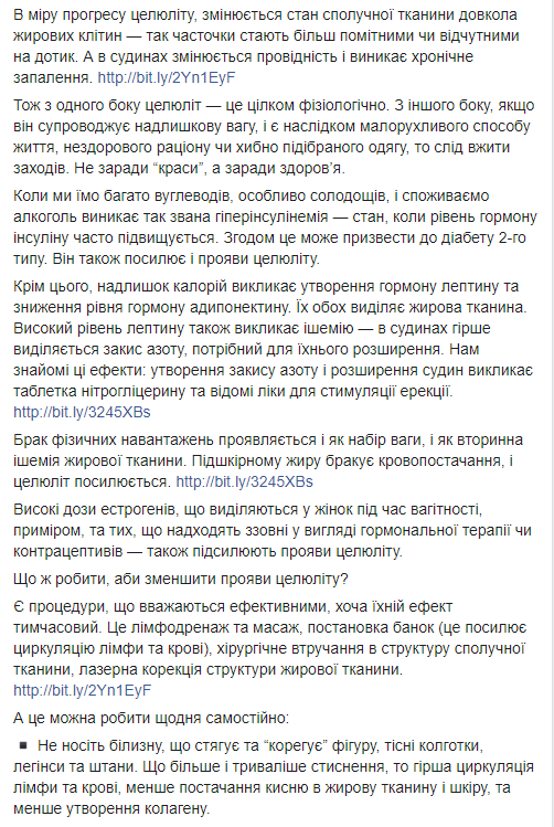 "Поэтому, с одной стороны целлюлит - это вполне физиологично. С другой стороны, если он сопровождает избыточный вес и является следствием малоподвижного образа жизни, нездорового рациона или неправильно подобранной одежды, то следует принять меры. Не ради "красоты", а ради здоровья", - подчеркнула Супрун.