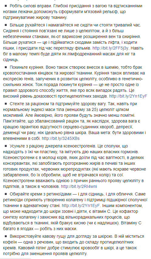 Тем не менее, чтобы уберечь себя от "апельсиновой корки" Супрун советует не носить утягивающее белье, делать силовые упражнения, больше двигаться, бросить курить, пользоваться кремами с ретиноидами и кофейными скрабами, а также следить за рационом и поддерживать здоровый вес.