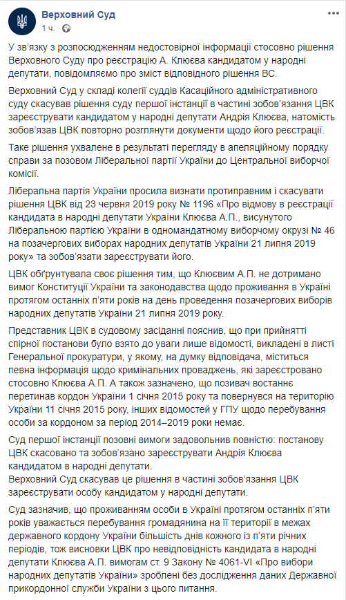 Соответствующее решение было принято в результате пересмотра в апелляционном порядке дела по иску Либеральной партии Украины к ЦИК. ЦИК, в свою очередь, обосновала свое решение тем, что Клюевым не соблюдены требования Конституции Украины и законодательства о проживании в Украине на протяжении последних пяти лет на день проведения внеочередных выборов народных депутатов.