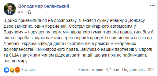 Глава Украины Владимир Зеленский заявил, что обстрел санитарного автомобиля в районе Водяного является "позорной и подлой попыткой" сорвать тяжелый переговорный процесс по урегулированию конфликта на Донбассе. Об этом он написал на своей странице в Facebook.