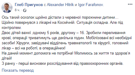 "Двух тяжелых ночью прооперировали. 16-летний парень все еще на искусственной вентиляции легких, но врачи говорят, что стабильный. 5-летний малый - в сознании. Еще двух сейчас начали оперировать", - написал он.