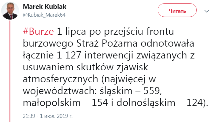 Директор Государственного центра безопасности Марек Кубяк написал в Twitter о многочисленных перебоях с электроснабжением. По его словам, после шторма пожарные бригады 1127 раз выезжали на вызовы, чтобы устранить последствия разгула стихии.