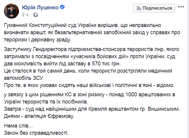 "Гуманный Конституционный суд Украины решил, что неправильно определять арест как безальтернативную меру пресечения по делам о терроризме и государственной измене. Заместителю гендиректора предприятия-спонсора террористов "ЛНР", которого задержали с удостоверением "участника боевых действий" против Украины, суд дал возможность выйти под залог в 570 000 грн. Это произошло в тот самый день, когда террористы расстреляли медицинский автомобиль ВСУ", - написал Генпрокурор.