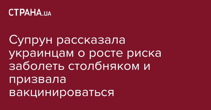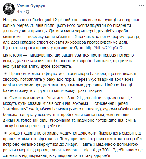 На Львовщине 12-летний мальчик заболел столбняком после того, как упал на улице и поцарапал колено. У ребенка не было прививки от этой болезни. У него диагностировали легкую степень столбняка, но неизвестно, как болезнь поведет себя дольше. Об этом на своей странице в соцсети написала и.о. министра здравоохранения Ульяна Супрун.