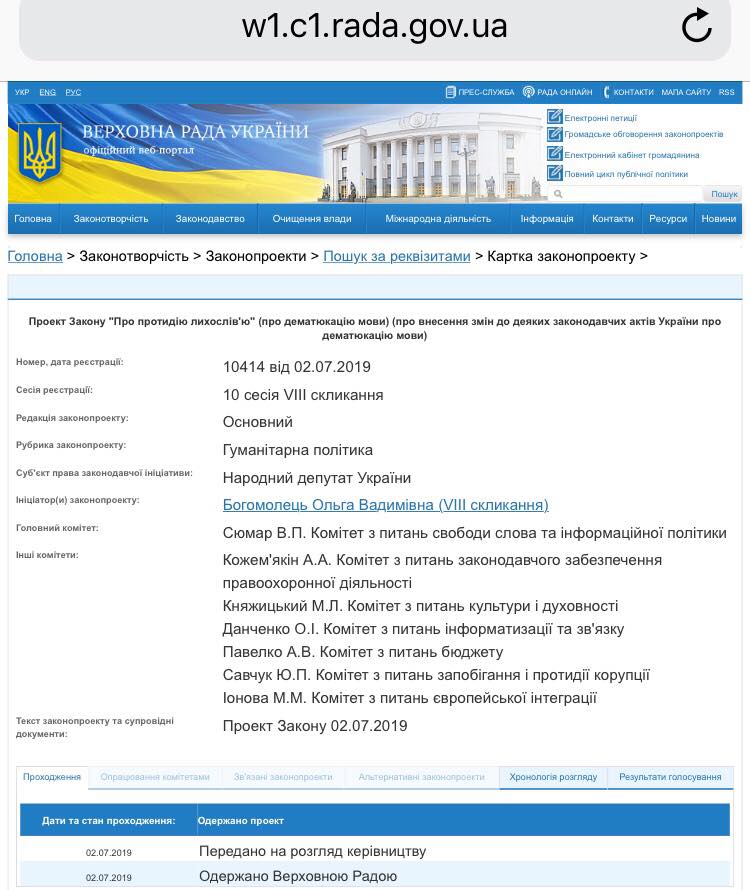 Автором законопроекта выступила народный депутат Ольга Богомолец. Главным комитетом значится комитет по вопросам свободы слова и информационной политики Виктории Сюмар.