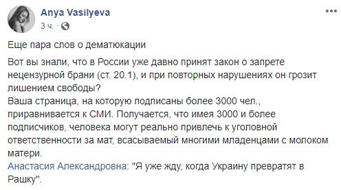 Маркетолог из Киева Анна Васильева: "Еще пара слов о дематюкации. Вот вы знали, что в России уже давно принят закон о запрете нецензурной брани (ст. 20.1), и при повторных нарушениях он грозит лишением свободы?