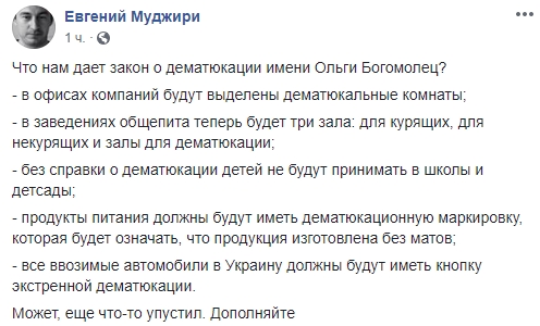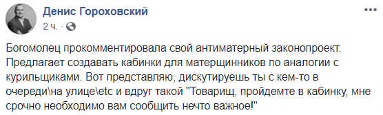 "Богомолец прокомментировала свой антиматерный законопроект. Предлагает создавать кабинки для матерщинников по аналогии с курильщиками. Вот представляю, дискутируешь ты с кем-то в очереди\на улице\etc и вдруг такой "Товарищ, пройдемте в кабинку, мне срочно необходимо вам сообщить нечто важное!"", - шутит блогер Денис Гороховский.