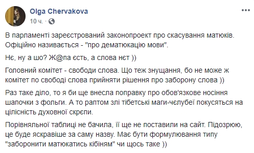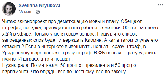 "Читаю законопроект про дематюкацию мовы и плачу. Обещают штрафы, посадки, принудительные работы за матюки. 90 тыс за слово х@й в эфире. Только у меня сразу вопрос. Пишут, что список запрещенных слов будет утверждать Кабмин. А как в таком случае его огласить? Если в интернете вывешивать нельзя - сразу штраф, в Урядовом курьере нельзя - сразу штраф. В ФБ нельзя - сразу удалить нужно. И штраф, а то и посадят.