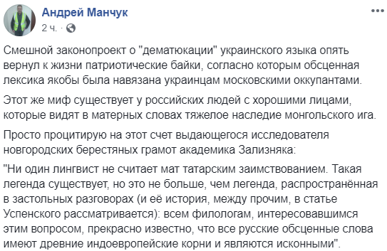 "Смешной законопроект о "дематюкации" украинского языка опять вернул к жизни патриотические байки, согласно которым обсценная лексика якобы была навязана украинцам московскими оккупантами.