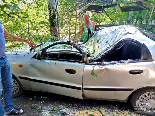 Расплющенный упавшим деревом автомобиль. Фото: "Первый Криворожский"