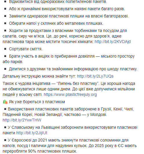"Сейчас в Украине нет законодательного регулирования по пластику и мусору в целом. Но важно понимать, что борьба с загрязнением планеты - дело каждого. И ответственность каждого. Магазины уже предлагают альтернативу пакетам, кафе дают скидки тем, кто приходит с собственными чашками, а заведения заменяют пластиковые трубочки бумажными или металлическими. А инициативы по сортировке мусора становятся все популярнее в Украине", - говорится в сообщении.