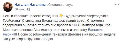"Есть и хорошие новости сегодня!!!! Суд выпустил "переводчика Гройсмана" Станислава Ежова под домашний арест. С момента задержания он безальтернативно провел в СИЗО полтора года. Ура! Мои поздравления Станиславу, его семье и адвокату Валентин Рыбин!!!! После освобождения генерала Щеголева на прошлой неделе это уже вторая крупная победа!", - написала она.