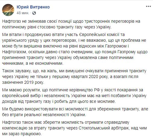 "Мы приветствовали и продолжаем приветствовать участие Европейской комиссии и украинского правительства в этих переговорах. Не считаем, что эта проблема может быть решена исключительно на уровне отношений между "Газпромом" и "Нафтогазом", поскольку давно стало очевидным, что позиция "Газпрома" о прекращении транзита через Украину обусловлена именно политическими факторами, а не экономическими", – подчеркнул исполнительный директор НАК. По его словам, "Нафтогаз" также должен сохранить возможность получить справедливую компенсацию за потерю транзита через Стокгольмский арбитраж, над чем сейчас работает.