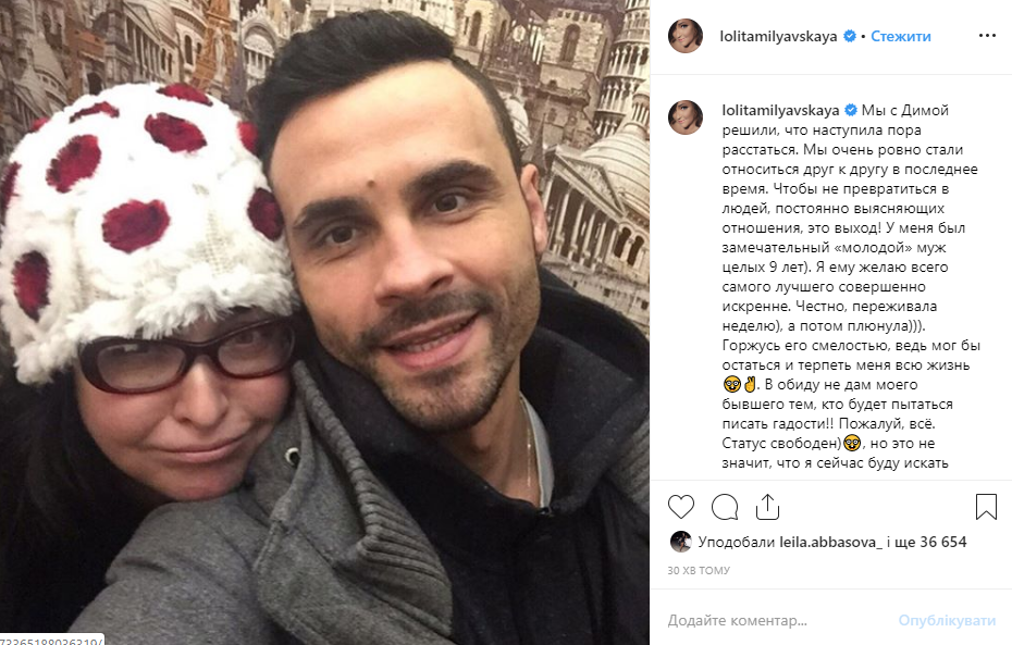 "Мы с Димой решили, что наступила пора расстаться. Мы очень ровно стали относиться друг к другу в последнее время. Чтобы не превратиться в людей, постоянно выясняющих отношения, это выход! У меня был замечательный "молодой" муж целых 9 лет). Я ему желаю всего самого лучшего совершенно искренне. Честно, переживала неделю), а потом плюнула)))", - написала Лолита.