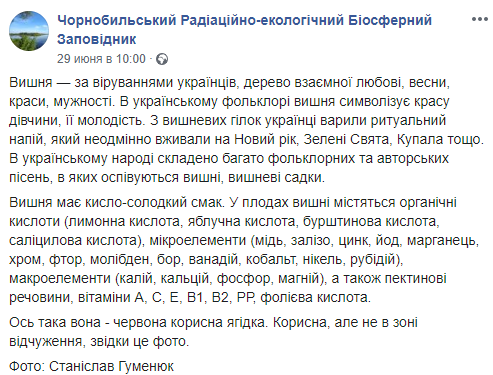 "Вишня имеет кисло-сладкий вкус. В плодах вишни содержатся органические кислоты (лимонная кислота, яблочная кислота, янтарная кислота, салициловая кислота), микроэлементы (медь, железо, цинк, йод, марганец, хром, фтор, молибден, бор, ванадий, кобальт, никель, рубидий), макроэлементы (калий, кальций, фосфор, магний), а также пектиновые вещества, витамины а, С, Е, В1, В2, РР, фолиевая кислота. Вот такая она - красная полезна ягодка. Полезная, но не в зоне отчуждения, откуда это фото", - предостерегают на странице Чернобыльского радиационно-экологического биосферного заповедника. Там же демонстрируется, какие красивые плоды уродились на вишневых деревьях в зоне отчуждения.