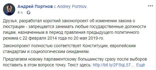 Экс-заместитель главы администрации Виктора Януковича, юрист Андрей Портнов предлагает расширить закон о люстрации, распространив его на всех чиновников, которые занимали должности во времена режима бывшего президента Петра Порошенко. Об этом Портнов заявил на своей странице в соцсети Facebook.