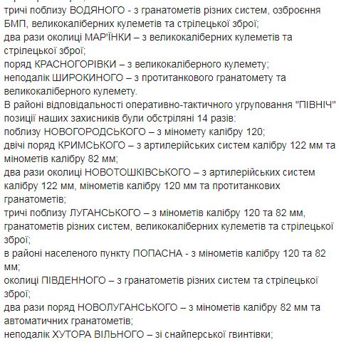 "С начала текущих суток враг 6 раз обстрелял позиции Объединенных сил. В районе ответственности оперативно-тактической группировки "Восток" враг совершил четыре обстрела позиций украинских защитников: возле Водяного, Новотроицкого, в районе Николаевки и окрестности Богдановки. В районе ответственности оперативно-тактической группировки "Север" украинские позиции были обстреляны два раза: возле Крымского и Новотошковского", - говорится в отчете.